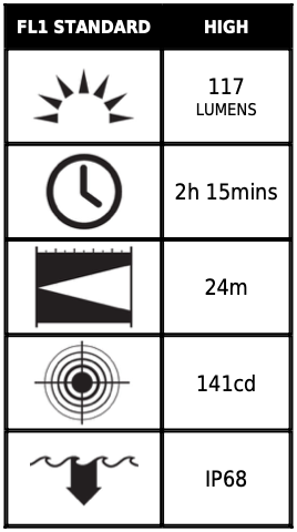 - Material: Körper aus ABS, Linse aus Polycarbonat
